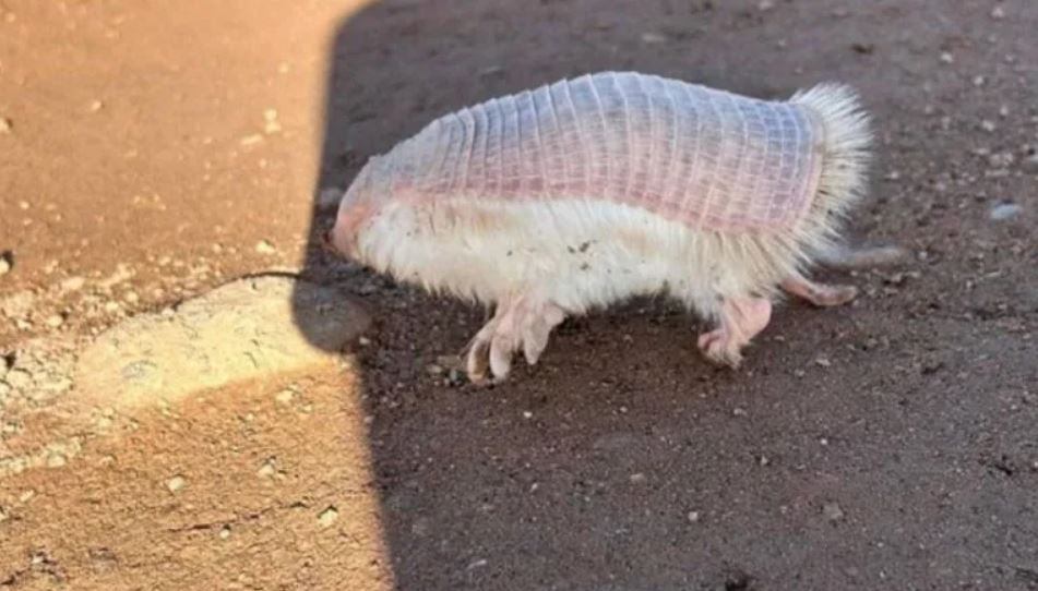 En las imágenes se ve al animal de color rosado, pequeño, un tanto desorientado. “Compartan así pueden conocer a este animalito que es muy difícil de ver y está en peligro de extinción”, escribió en su posteo el vecino, Hugo Reguero. El ejemplar en cuestión es un pichiciego o armadillo hada rosa que, en muy contadas ocasiones, se muestra frente a los humanos.