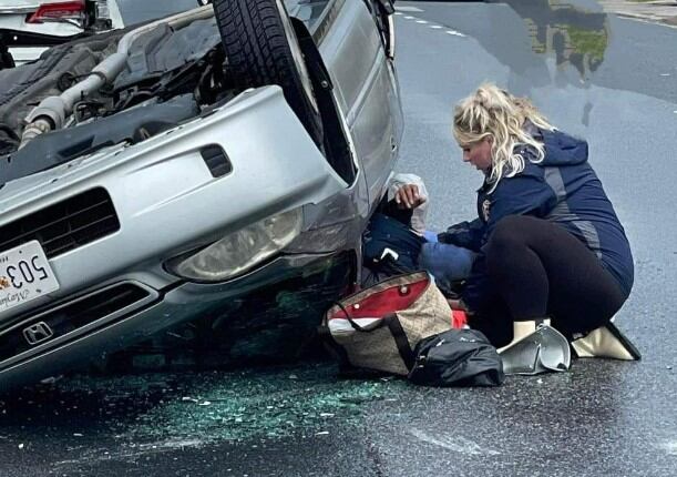 Vi el auto volteado y supuse que había alguien allí. Vi a una mujer atrapada y empecé a gatear para entrar, pero luego dije: ‘¿Qué estás haciendo? Estás embarazada de nueve meses’”, relató la mujer en el programa Today.