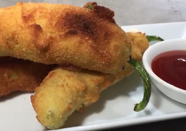 1.- Cortar los ajíes en la parte superior y rellenarlos con queso crema.