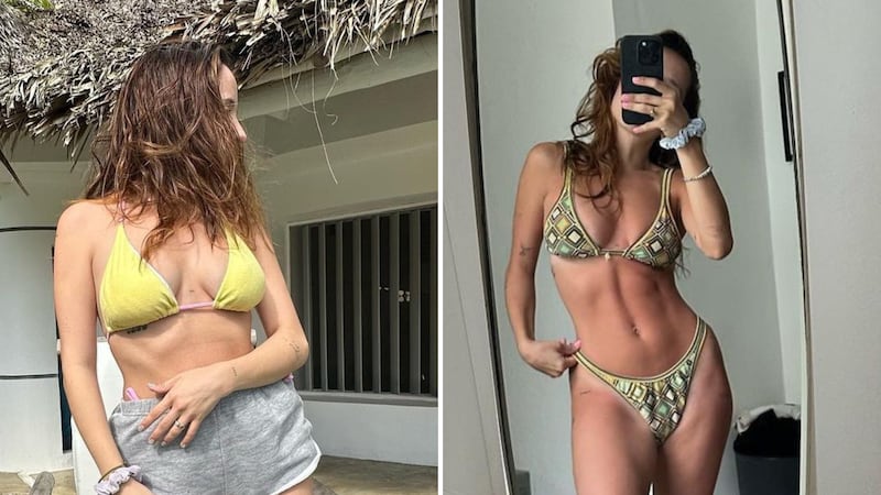 La modelo y conductora de televisión optó con un top de bikini con un fruncido en medio del escote en color verde verde menta, que le quedó fenomenal porque destacó su pecho. Su hermana también fue atinada, al usar un traje de baño en triángulo y con estampado floral.
