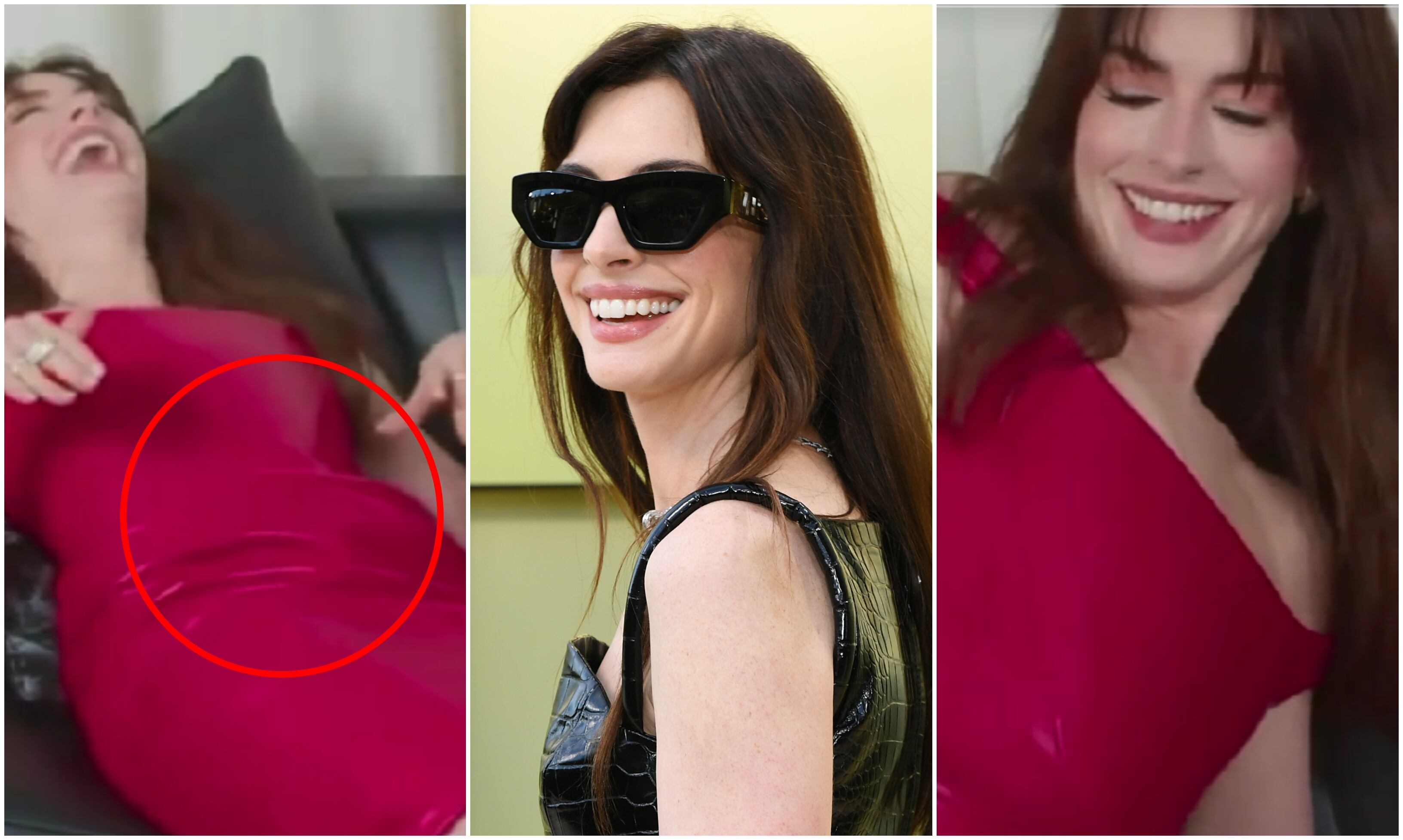 Anne Hathaway se lució con un vestido rojo de Versace pero nuevo video divide opiniones por lo incómoda que estaba