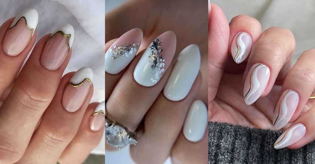 En la misma línea de probar cosas distintas con tus diseños de uñas blancas, no puedes dejar pasar la tendencia del foil. Este es un papel metalizado que se adapta a diversas formas de tu preferencia. Nos encanta porque le dan un aspecto lujoso a las manos, como si llevaras oro.