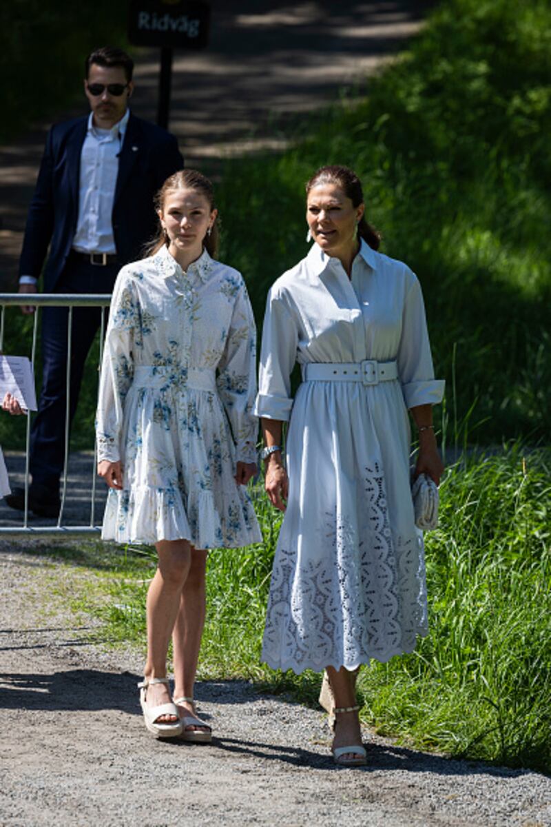 Por su lado, Estelle de Suecia lució una blusa estampada que combinó a la perfección con un traje blanco en una visita que realizó en 2022 al centro de visitantes del lago Takern en Ostergotland